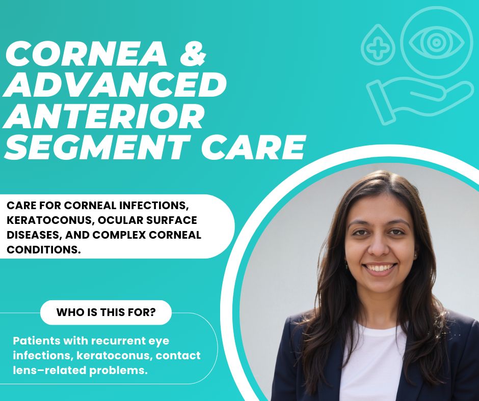 Trained at leading institutions including Seth GS Medical College, Mumbai and Maulana Azad Medical College, Delhi, she has extensive experience across comprehensive eye care, with focused expertise in cornea, refractive, and cataract services.