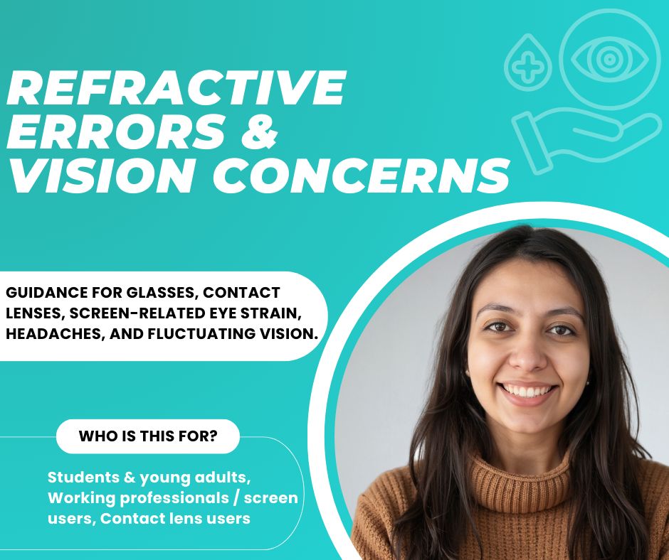 Difficulty seeing clearly, frequent change of glasses, or confusion about contact lenses and vision correction options.